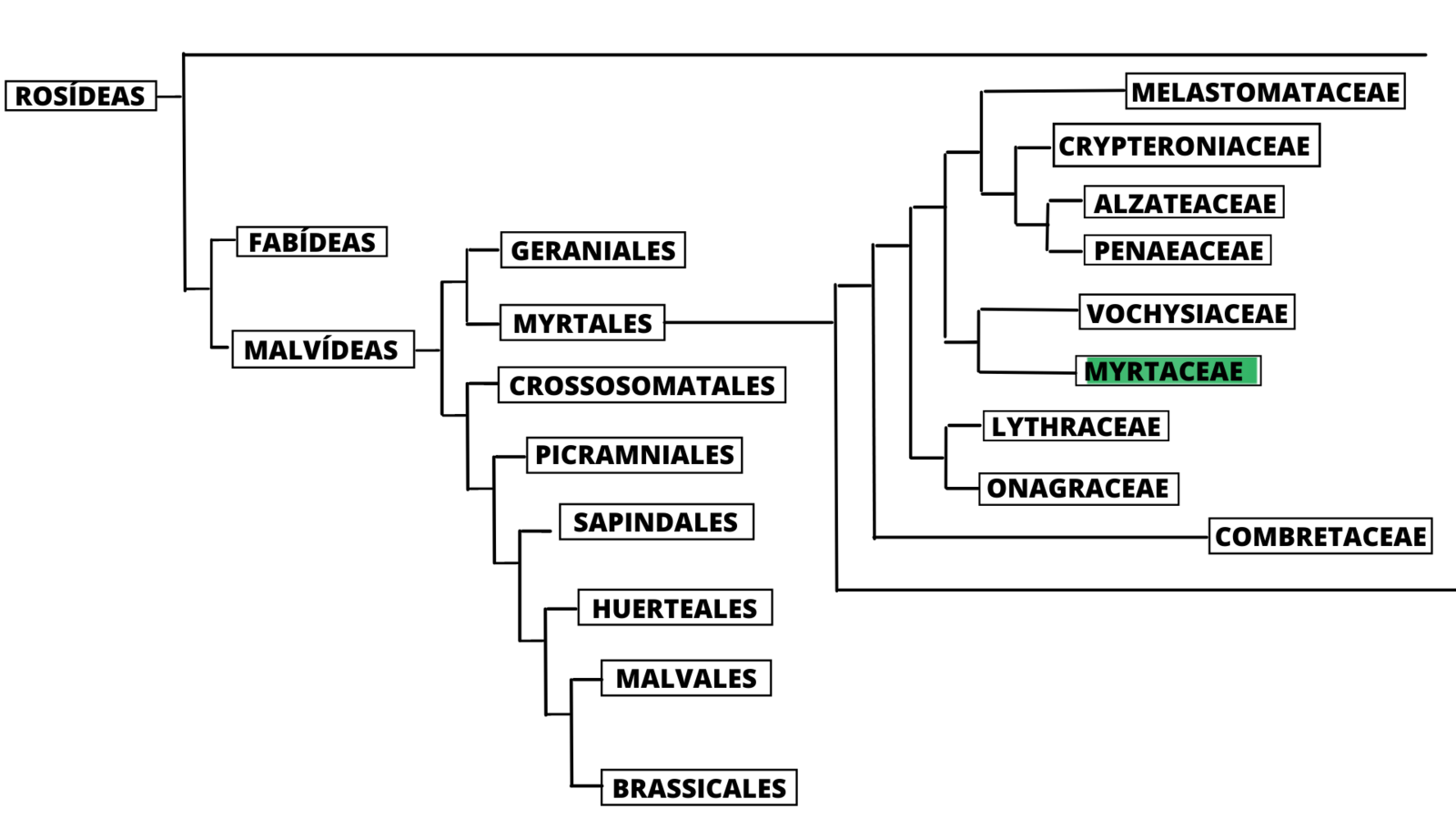 A família Myrtaceae está inserida na ordem Myrtiflorae (Myrtales). Compreende esta família cerca de 150 gêneros com aproximadamente 3600 espécies, sendo a segunda maior família da ordem.